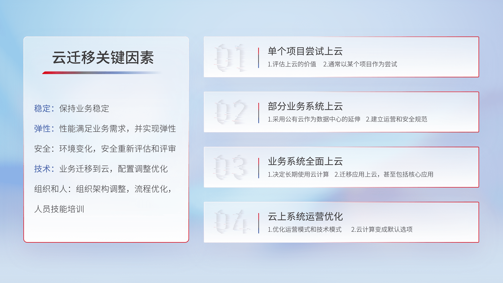 结合实际业务,,从规划设计、、、云平台选型、、、、云原生改造、、、数据迁移、、、集成交付,,迁移全过程为客户识别最佳上云路径,,做好风险识别管理,,,设计网络架构、、身份权限、、、、安全审计合规、、、、操作审计、、、日志审计、、监控告警策略、、、、多站点容灾设计等,,,,对云上基础设施进行整体规划,,,,提升IT治理水平,,,以满足弹性、、、、高可用、、、、高性能的需求。。。。