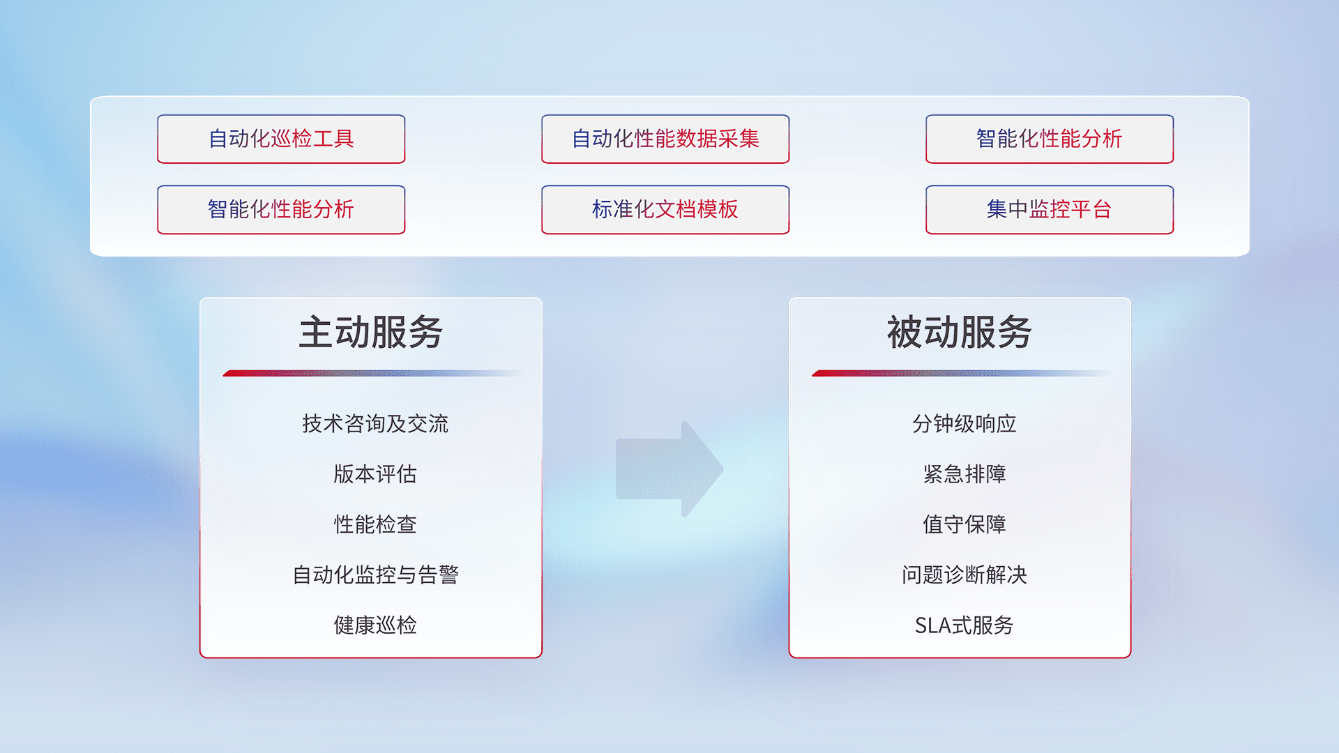 智能化工具和标准化文档,,保障服务质量,,,提供主动服务(包含技术咨询、、版本评估、、、性能检查、、、自动化监控与告警、、、健康巡检)和被动服务包含(分钟级响应、、、紧急排障、、值守保障、、、问题诊断解决、、SLA服务)。。。